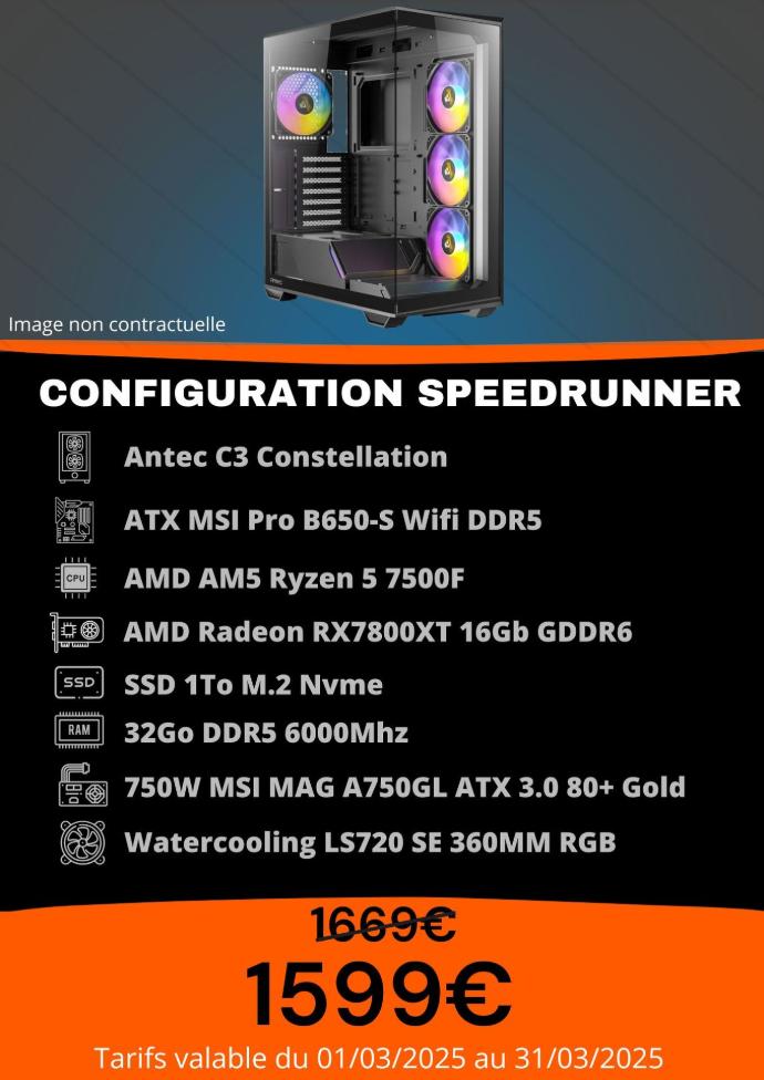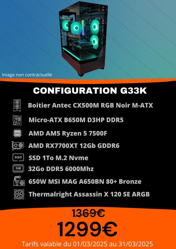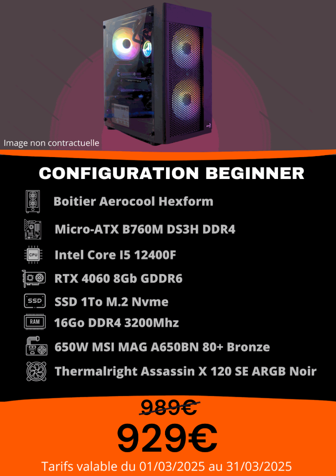 Idéale pour les gamers et le multitâche, cette configuration combine performance et rapidité, avec un excellent rapport qualité-prix, tout en assurant une expérience fluide dans les jeux récents en résolution full HD et les applications exigeantes.